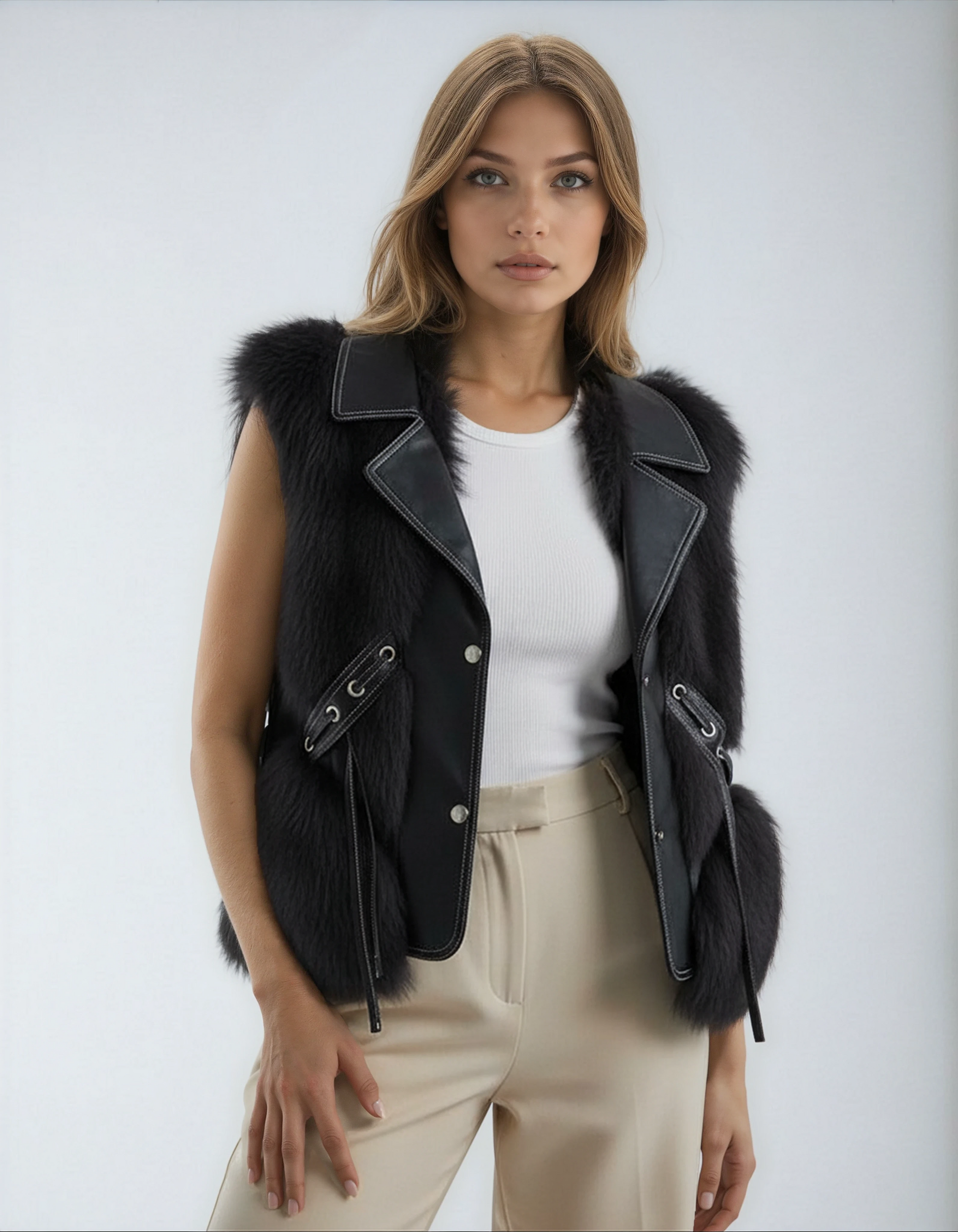 The Fur-Trim Vest brings together warmth, sophistication, and versatility. Designed with a plush faux fur texture, a tailored waist tie, and a refined collar, it adds instant luxury to any outfit. Whether worn over knitwear for daytime chic or layered with evening wear, this vest is a statement piece that blends comfort with style.