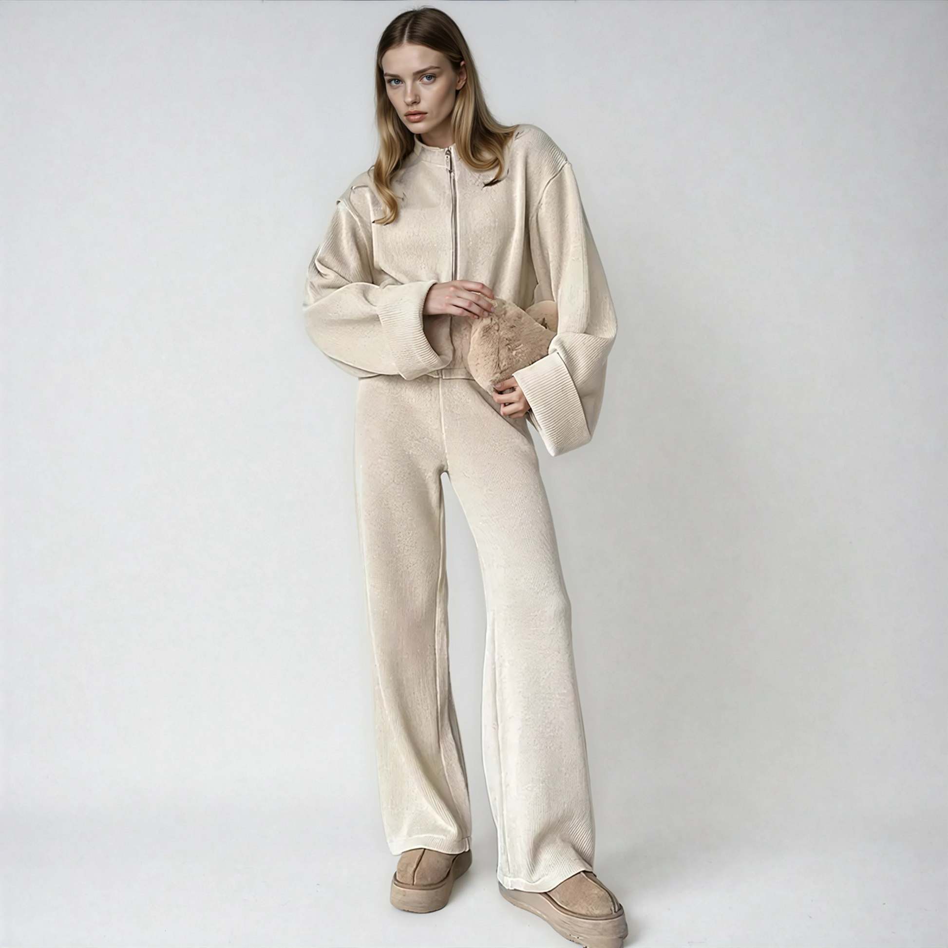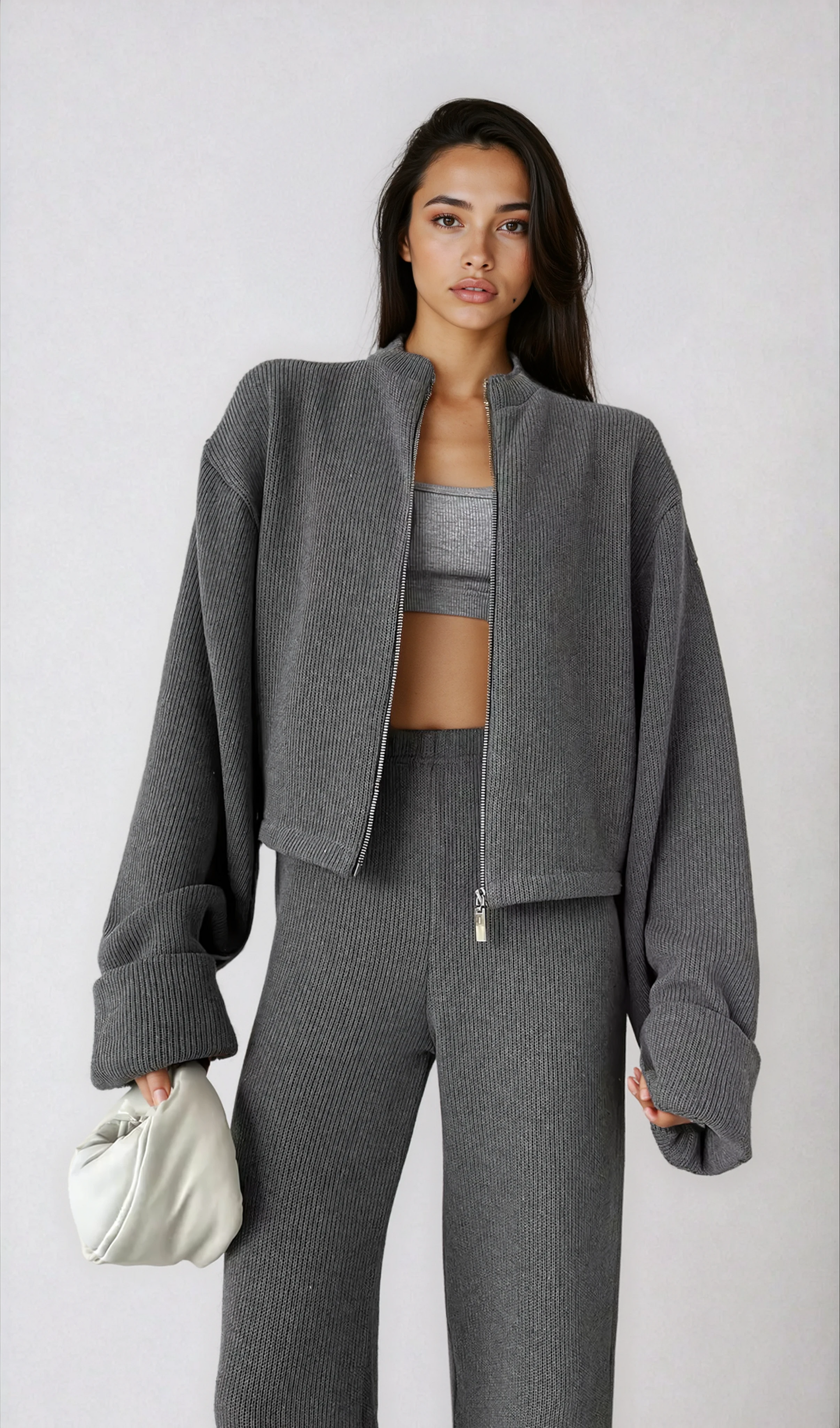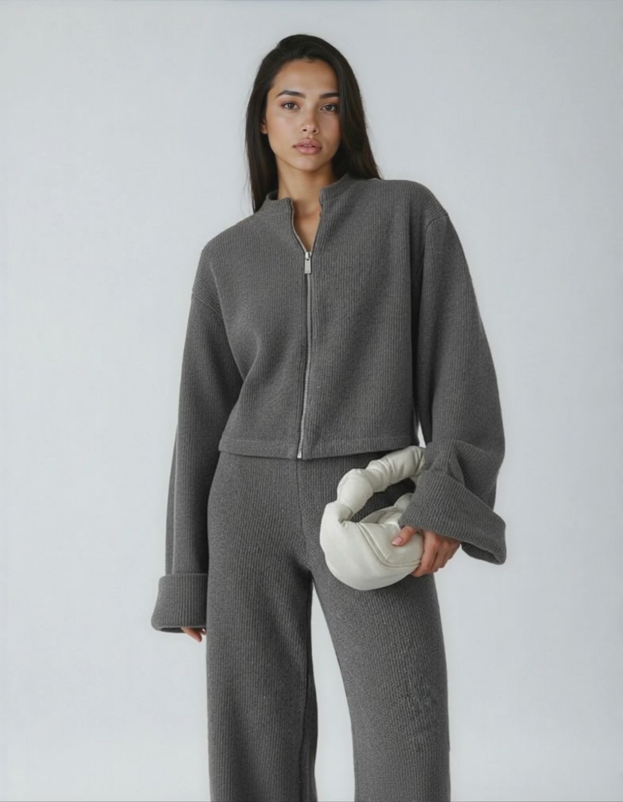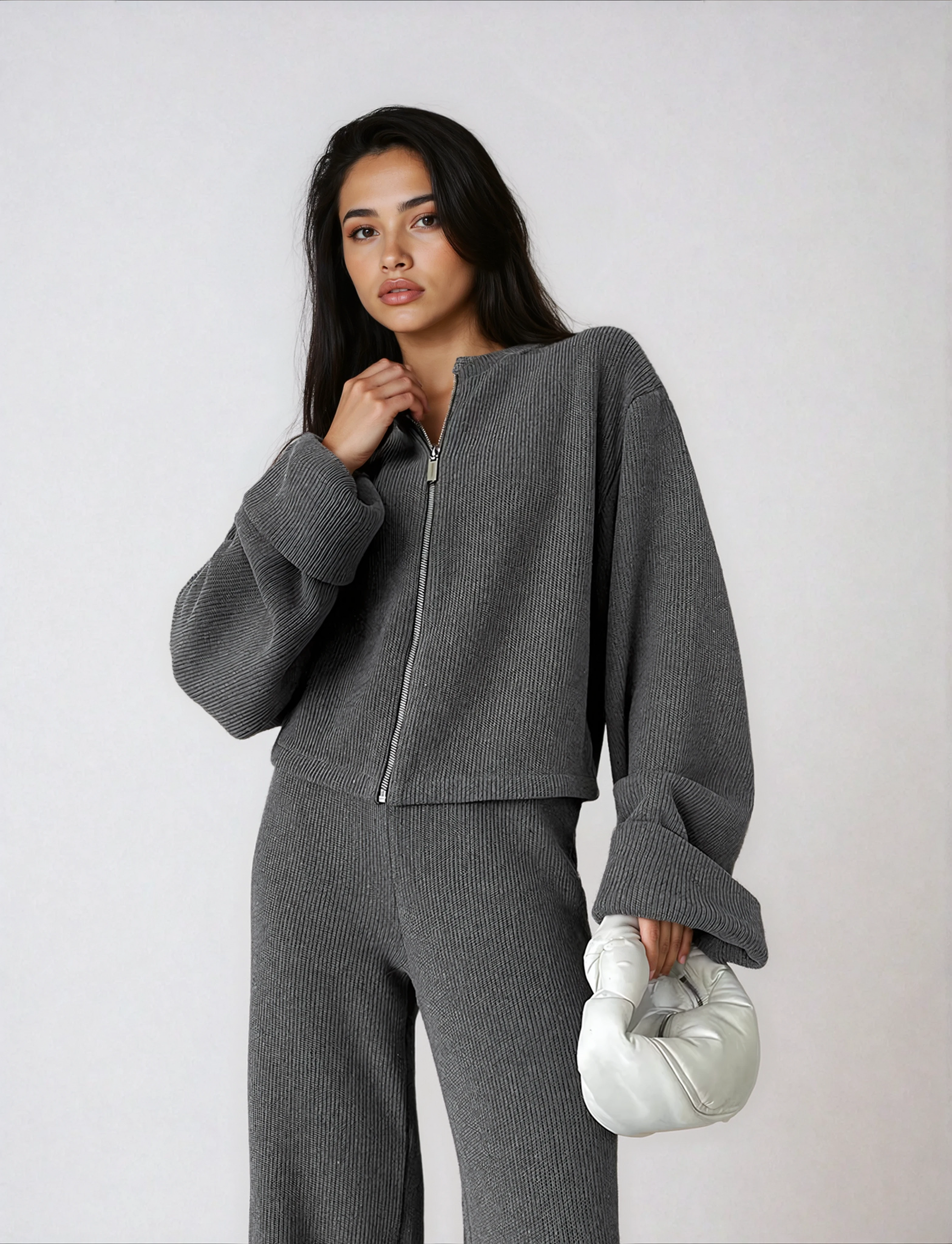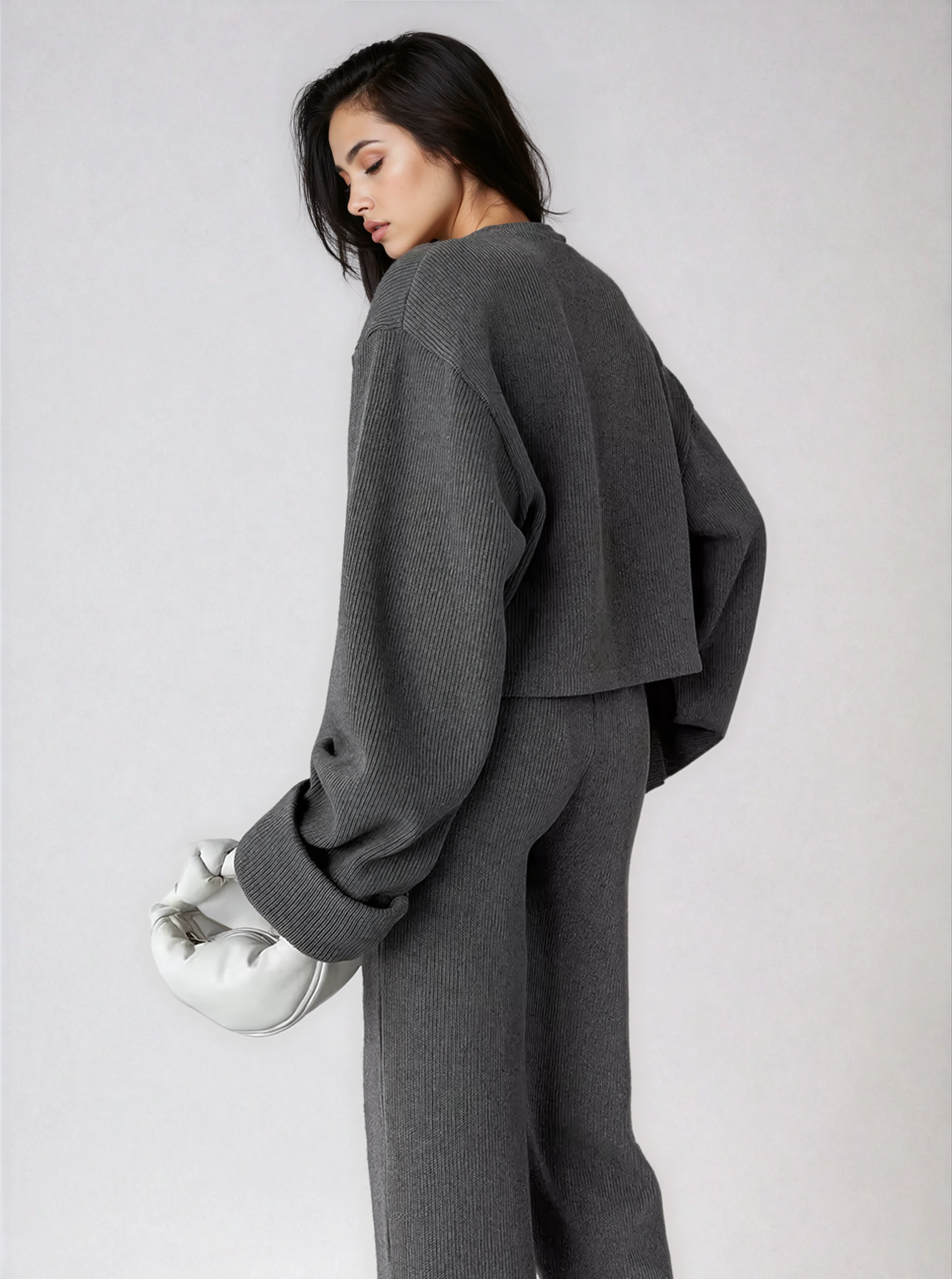 Ontworpen om naadloos over te gaan van rustige ochtenden naar verfijnde middagen, straalt deze set ingetogen elegantie uit, een statement van kalme zelfverzekerdheid en moderne vrouwelijkheid.