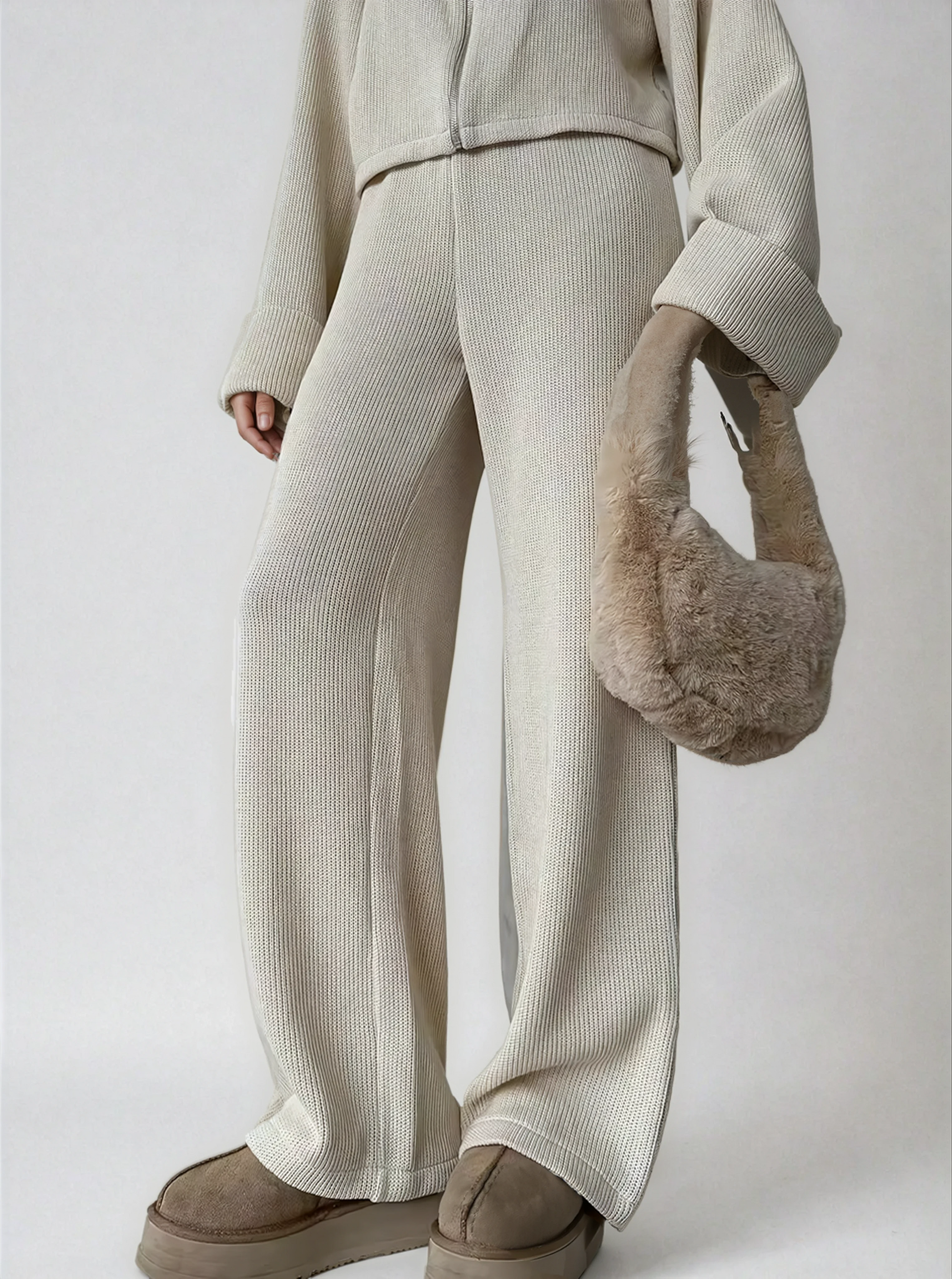 De Lior Duo belichaamt de perfecte balans tussen moeiteloos comfort en verfijnd minimalisme. Gemaakt van een zachte, middelzware gebreide stof, valt het natuurlijk met een subtiele structuur die elk silhouet flatteert. De ontspannen top met lange mouwen en de soepel vallende broek bewegen in stille harmonie en bieden warmte en elegantie tijdens de koelere seizoenen.