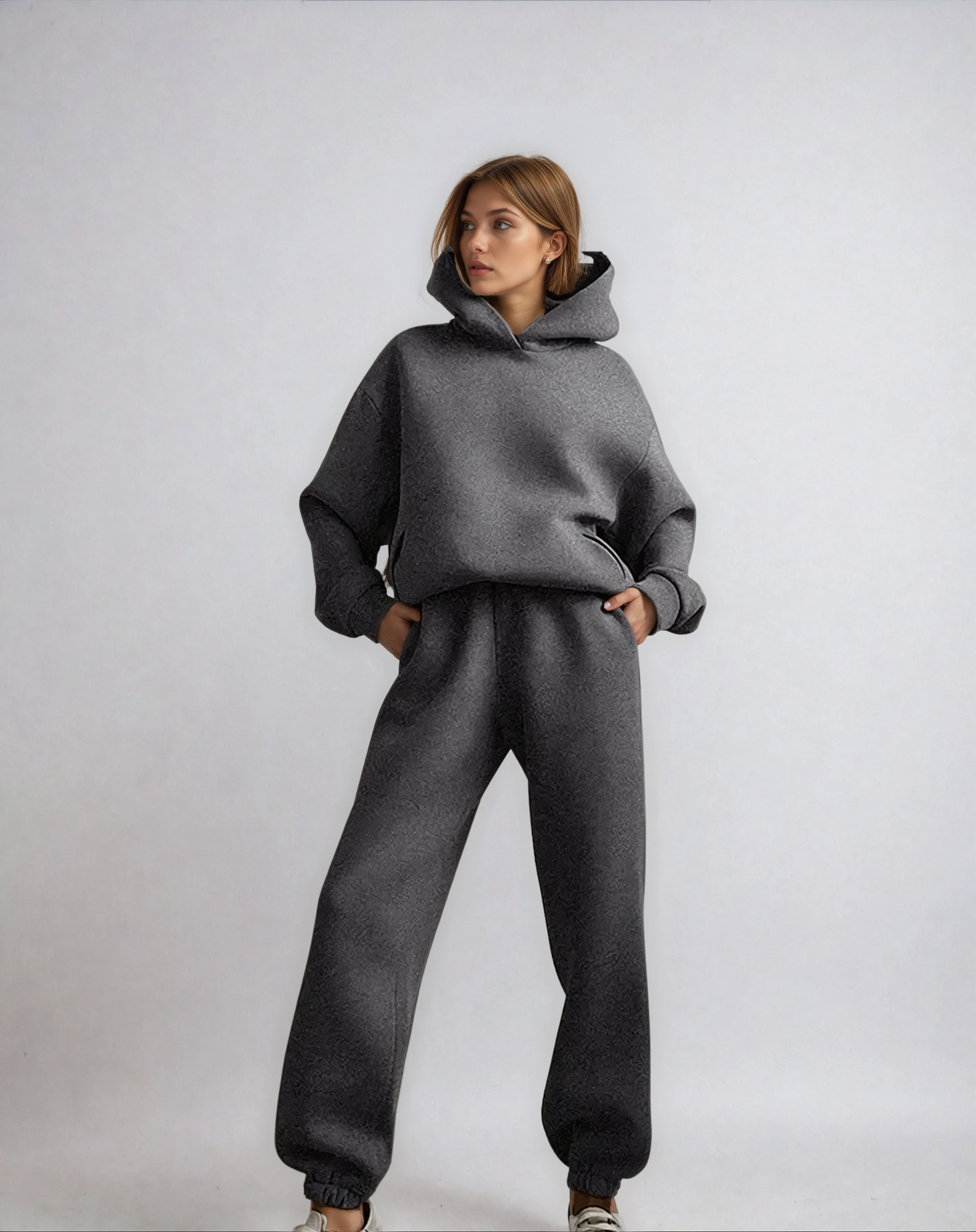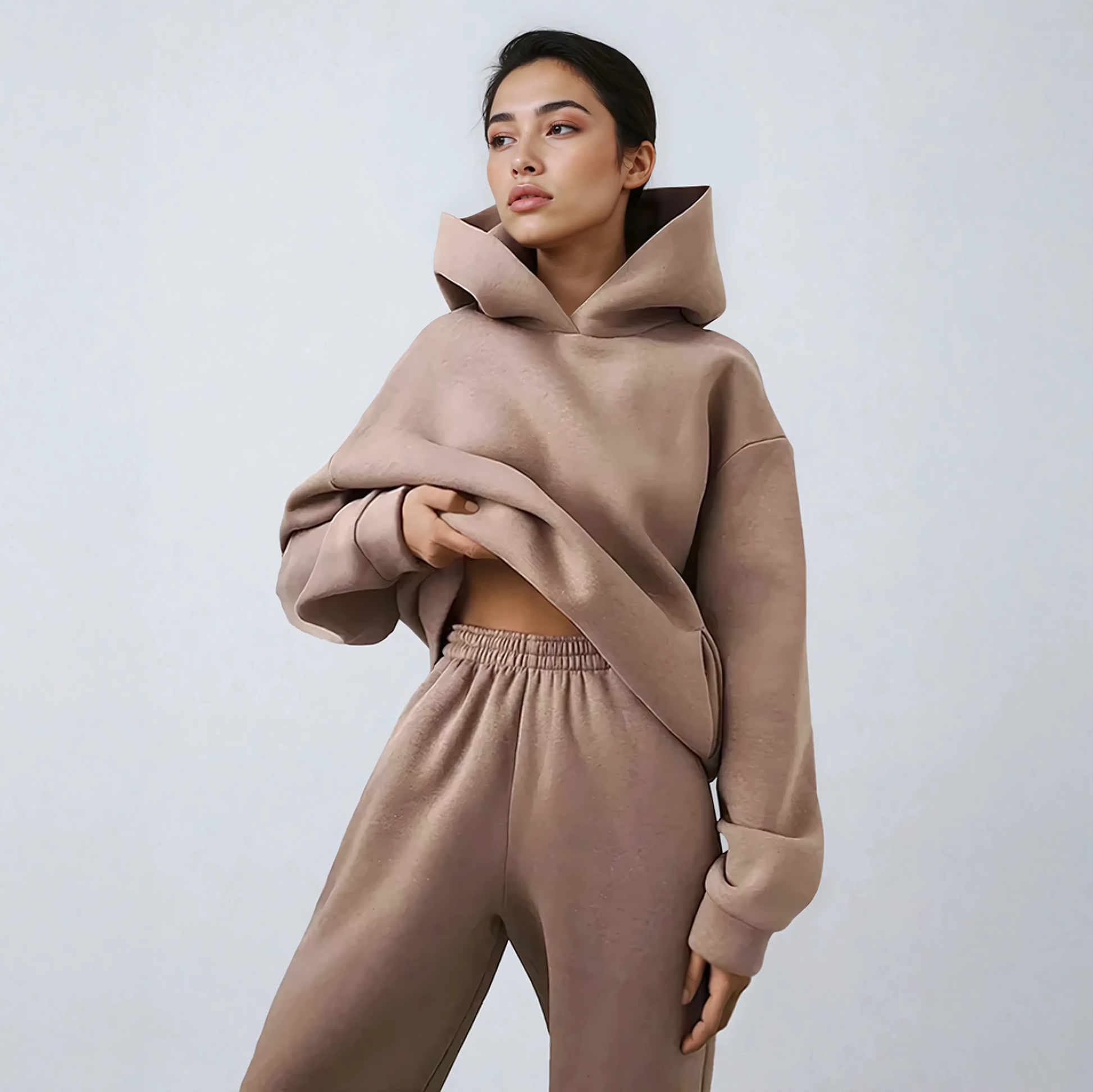 Conçu pour les périodes froides, le Survêtement d’Hiver allie chaleur, structure et minimalisme sans effort. Le haut à capuche présente une silhouette décontractée qui tombe naturellement, tandis que le pantalon assorti offre une coupe douce et confortable qui accompagne chacun de vos mouvements. Ensemble, ils composent une tenue à l’allure raffinée tout en conservant un charme cosy.